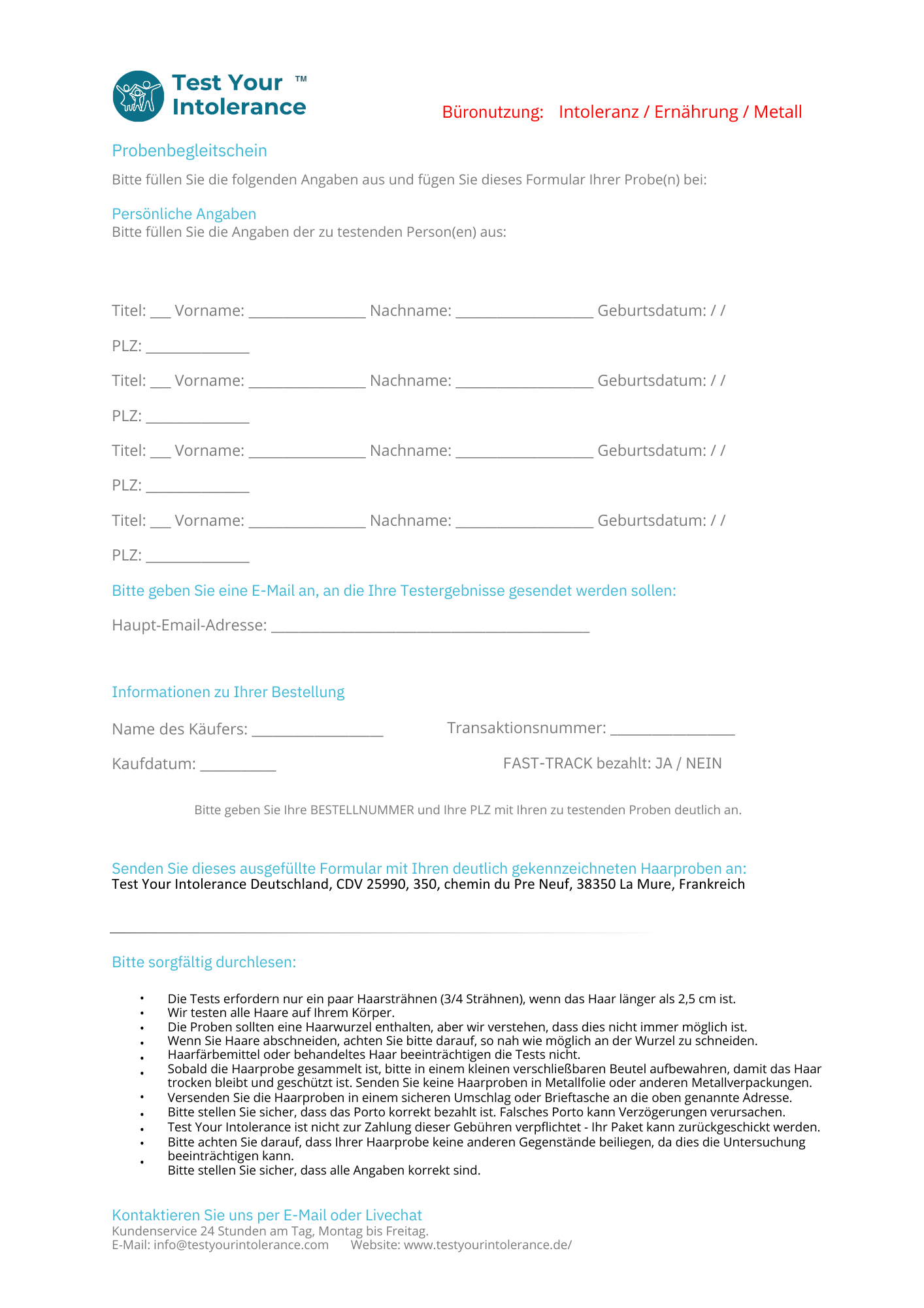Sie erhalten von uns ein Anmeldeformular, welches von Ihnen ausgefüllt werden muss… Schicken Sie uns dann das ausgefüllte Formular und Ihre Haarprobe per Post an die angegebene Adresse.